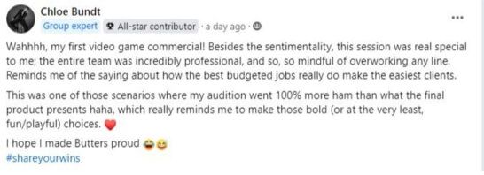 I am really excited to start my voice acting career! ... Thank you for teaching me the basics. [Later] I was in that live stream where you talked about the work flow! That was a good starting point.